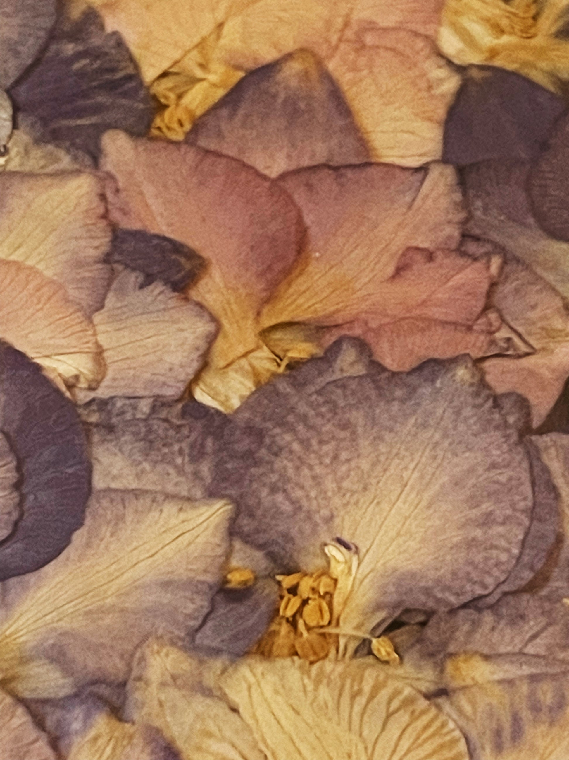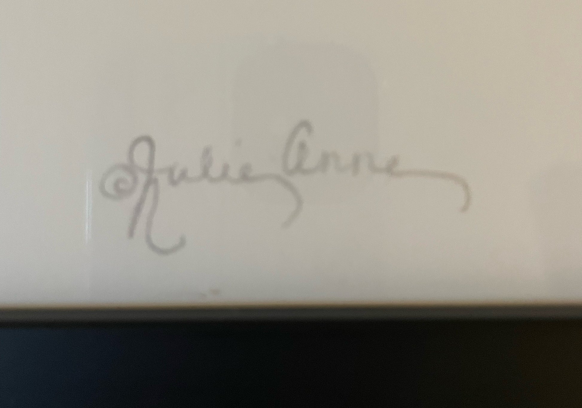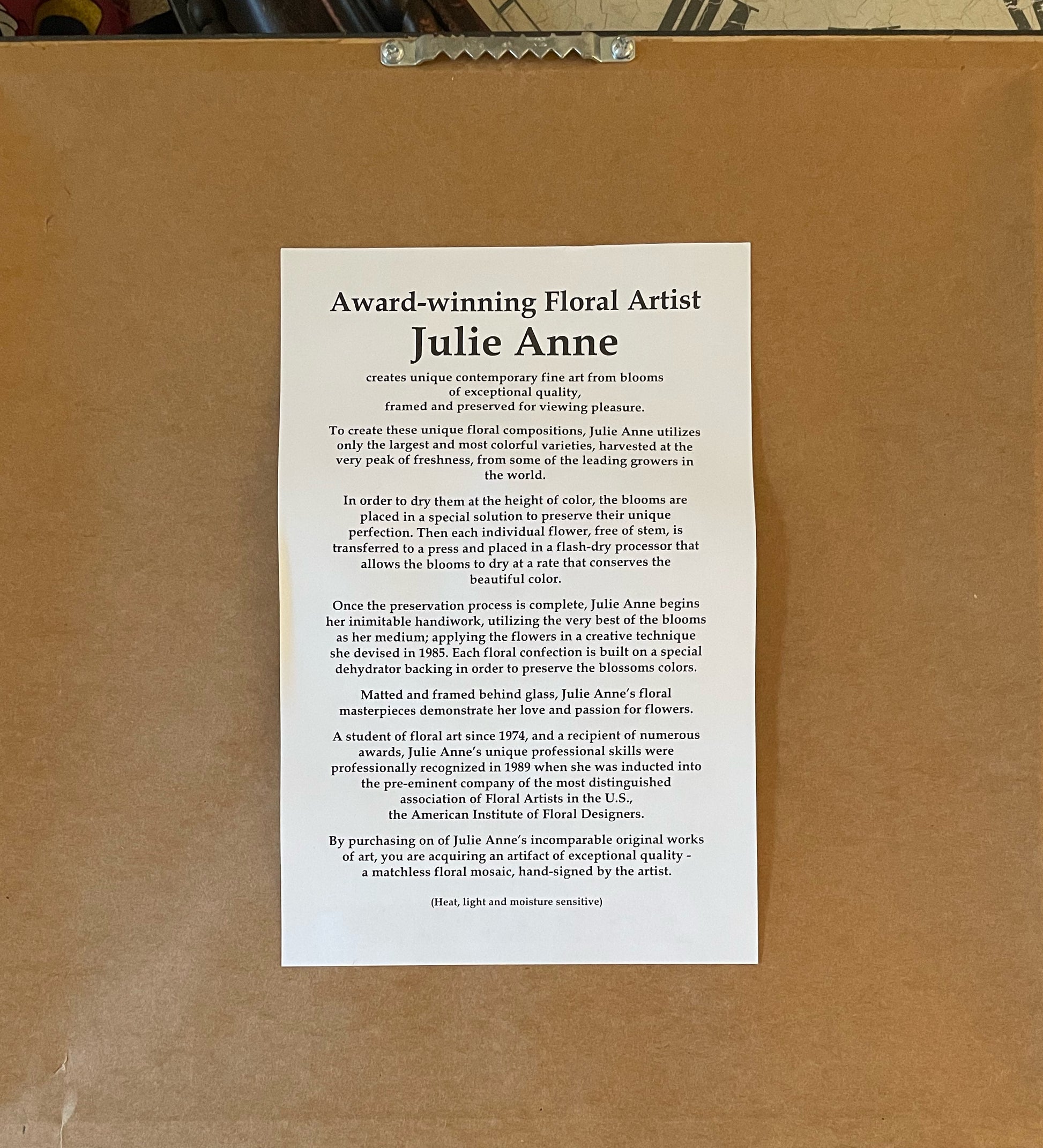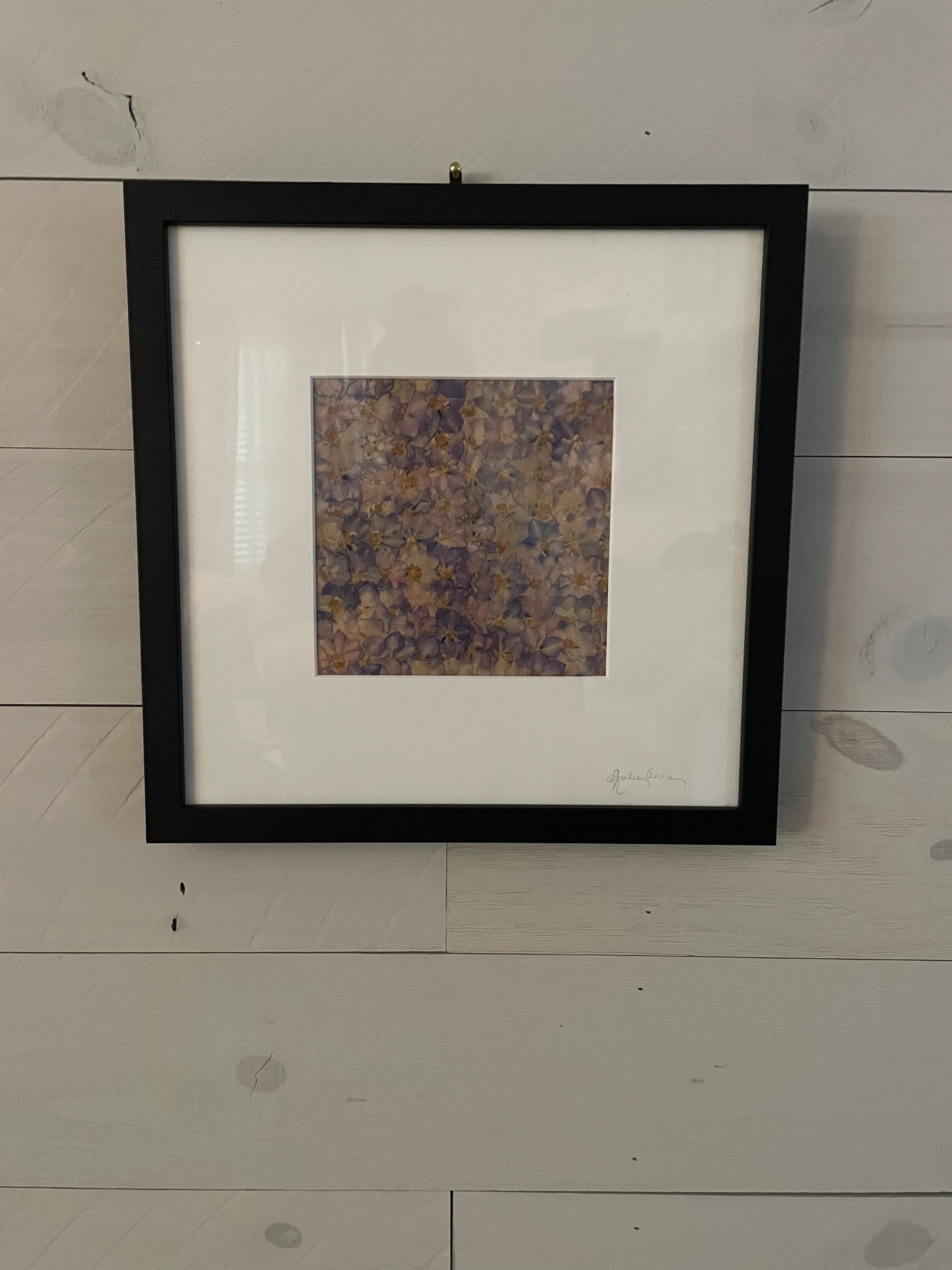 Julie Anne dried floral artwork in lovely pinks and purples. This piece is 13”x13” matted and framed behind glass. The artwork is 6”x6”.